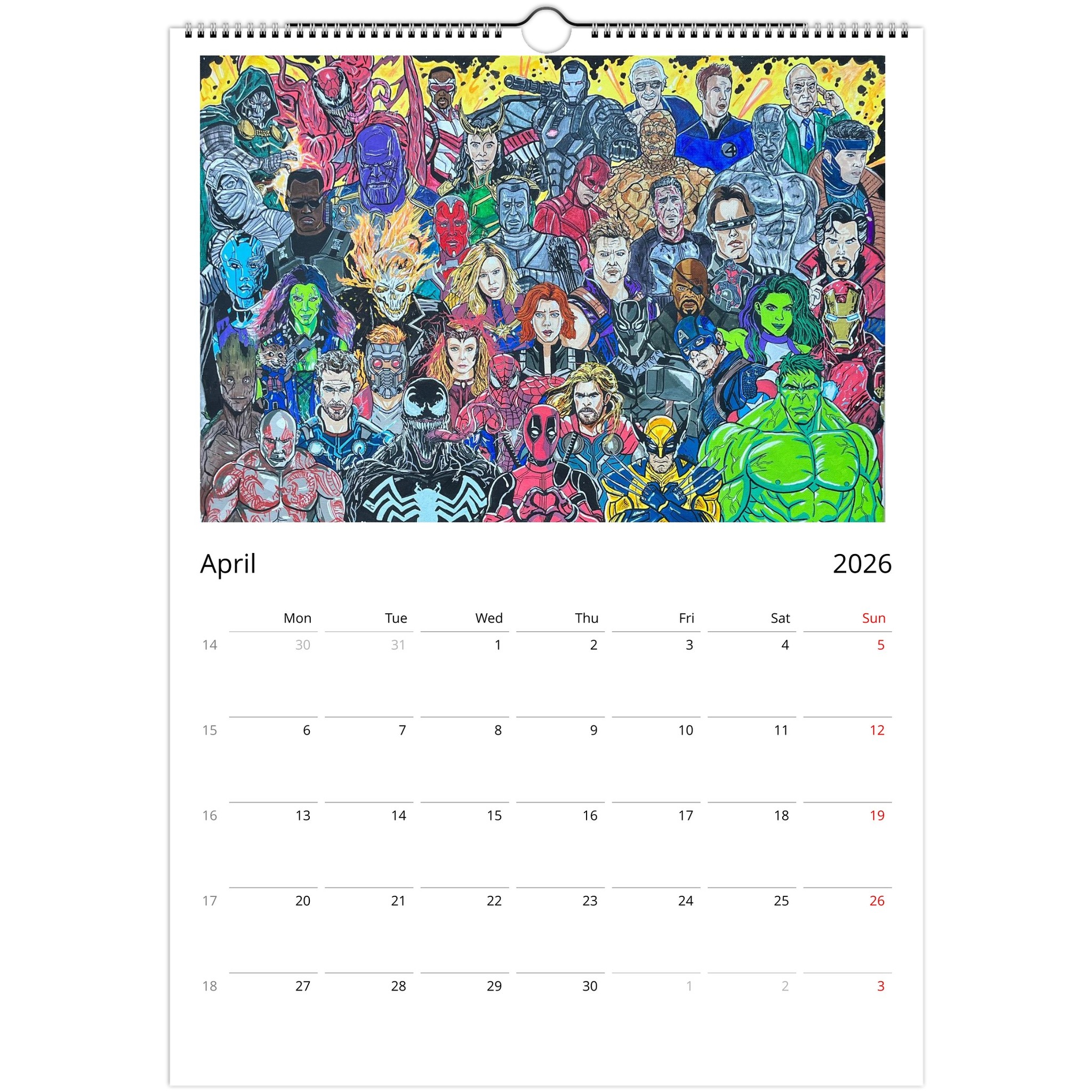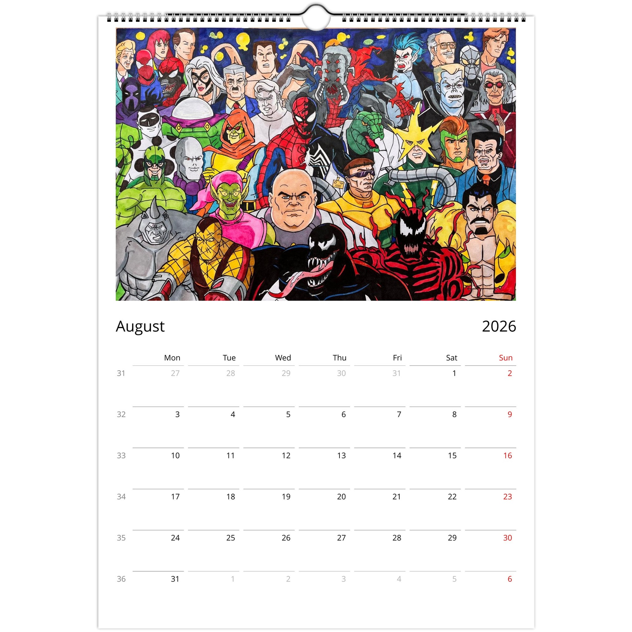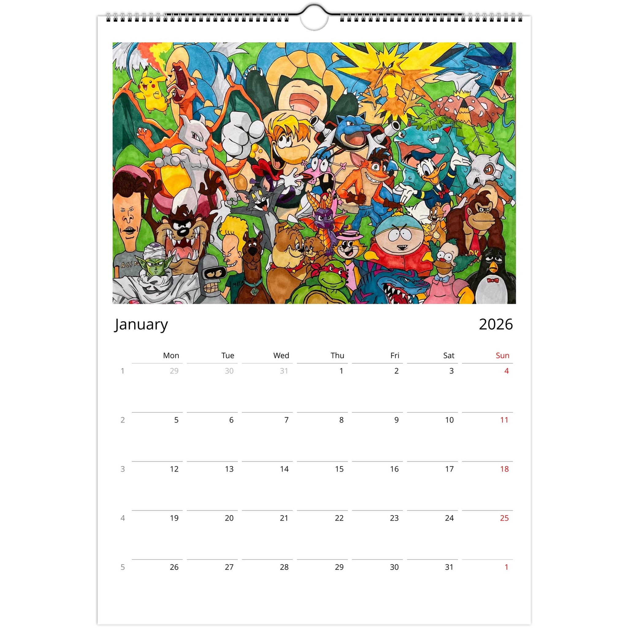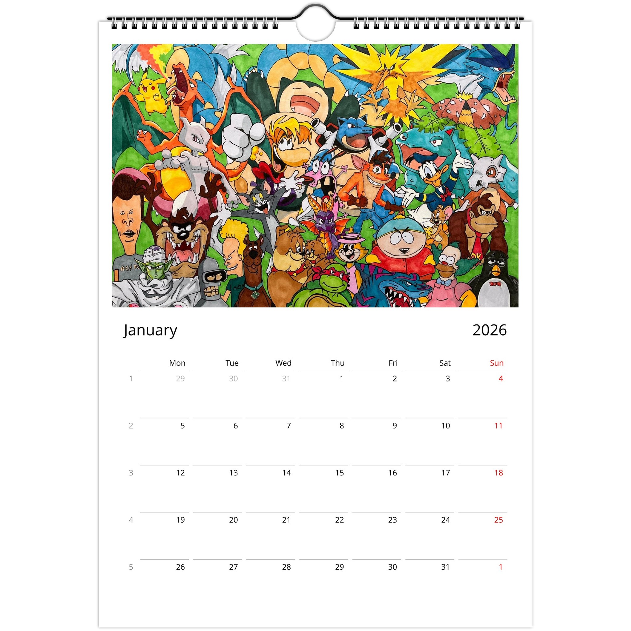 Introducing our Unique Wall Calendar featuring 12 eye-catching posters that showcase your favorite characters from Marvel, Disney, The Simpsons, and classic retro cartoons. Each month presents a stunning piece crafted from our beloved designs showcased on social media, now collected for your viewing pleasure!